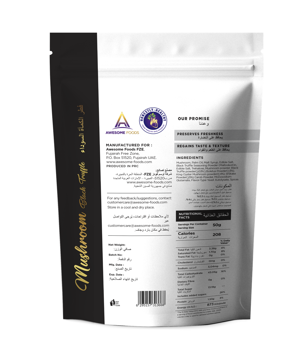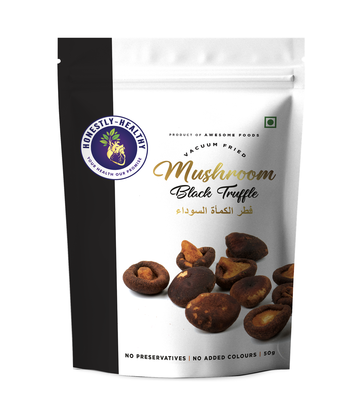 Whole mushrooms coated with black truffle, vacuum-fried at lower temperatures for delicate crunch. Less oil uptake than conventional frying, with a honest ingredient list.